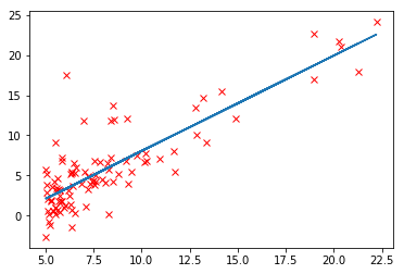 plt.plot( x, y,'rx', x, ypredict, '-');